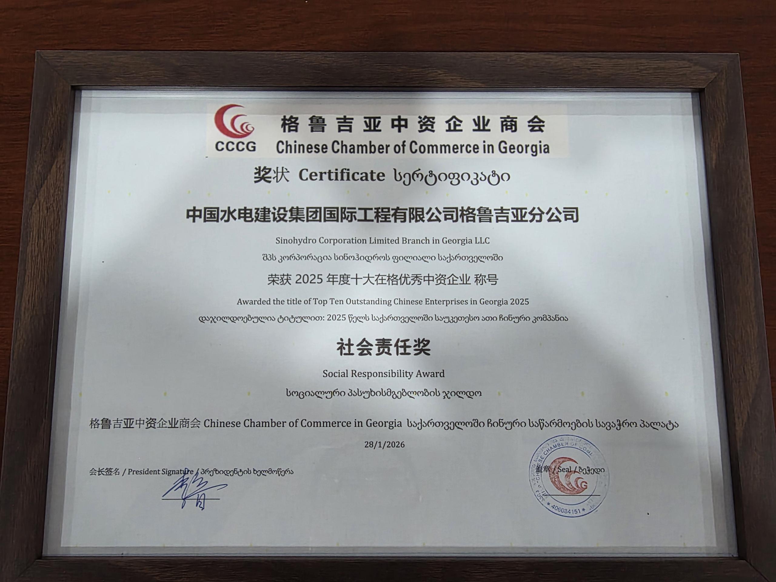 日前,在格魯吉亞中資企業商會舉辦的2026年新春年會上,中國水電國際工程公司格魯吉亞分公司被授予“2025年格魯吉亞十大優秀中資企業”稱號及“社會責任獎”。中國駐格魯吉亞大使館商務參贊趙秋艷出席儀式并頒獎。 格魯吉亞是水電十六局的自主經營國別,其國別代表及中國水電國際工程公司格魯吉亞分公司總經理均由水電十六局派員出任。此次殊榮,是商會對水電十六局長期以來堅持合規經營、嚴守安全環保底線的充分認可,也是對其在屬地化發展方面卓越成績的高度嘉獎。在項目履約中,水電十六局積極推動屬地采購,大幅提升本地員工雇傭比例,以實際行動踐行央企社會責任,樹立了中國企業的良好形象。 在項目實施過程中,水電十六局積極與所在地政府保持緊密聯動,切實解決困擾當地民眾的實際問題。在F0公路項目實施期間,項目部主動義務協助沿線村莊改建通行道路、新建排水溝渠,改善了村鎮基礎設施;2025年初,面對強暴雪天氣,項目部迅速響應政府號召,全力協助開展道路除雪保通任務,有效保障了村民出行安全,贏得了當地政府和民眾的高度贊譽。 |